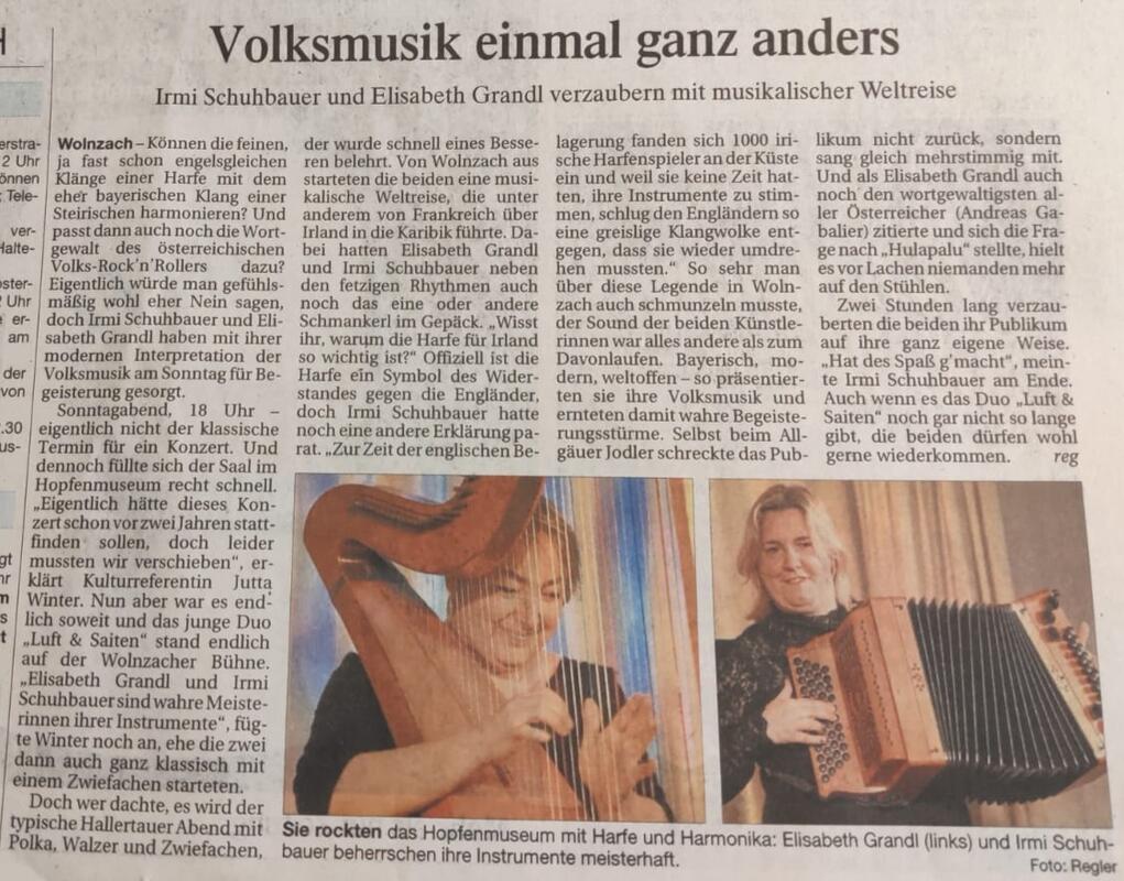 Zwei Frauen, die die Liebe zur Musik freundschaftlich verbindet, das ist die Duobesetzung Luft & Saiten mit steirischer Harmonika und Harfe. Mit klarer Präzision und höchstem Feingefühl leben Irmi Schuhbauer und Elisabeth Grandl ihre musikalische Leidenschaft auf ihren so unterschiedlichen Musikinstrumenten aus. Von frischen Klangstücken bis zu rhythmisch feurigem Heimatsound, bayrisch traditionell, aber auch weltoffen und experimentell, mit Sensibilität und Tiefgründigkeit, mit viel Humor und Herz – das zeichnet die Vielseitigkeit der beiden sympathischen Musikerinnen aus, die regelmäßig in Sendungen des Bayrischen Rundfunks und im Bayrischen Fernsehen zu erleben sind.